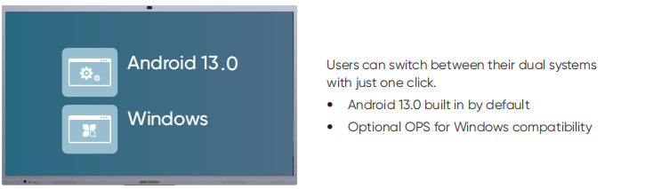 海康威视 (Hikvision) Value 系列 交互智能平板提供了卓越的便利性,支持用户通过 一键切换 (One-click) 在两大操作系统之间灵活跳转。设备预装了先进的 Android 13.0 操作系统,提供直观的交互界面和丰富的教育应用生态。