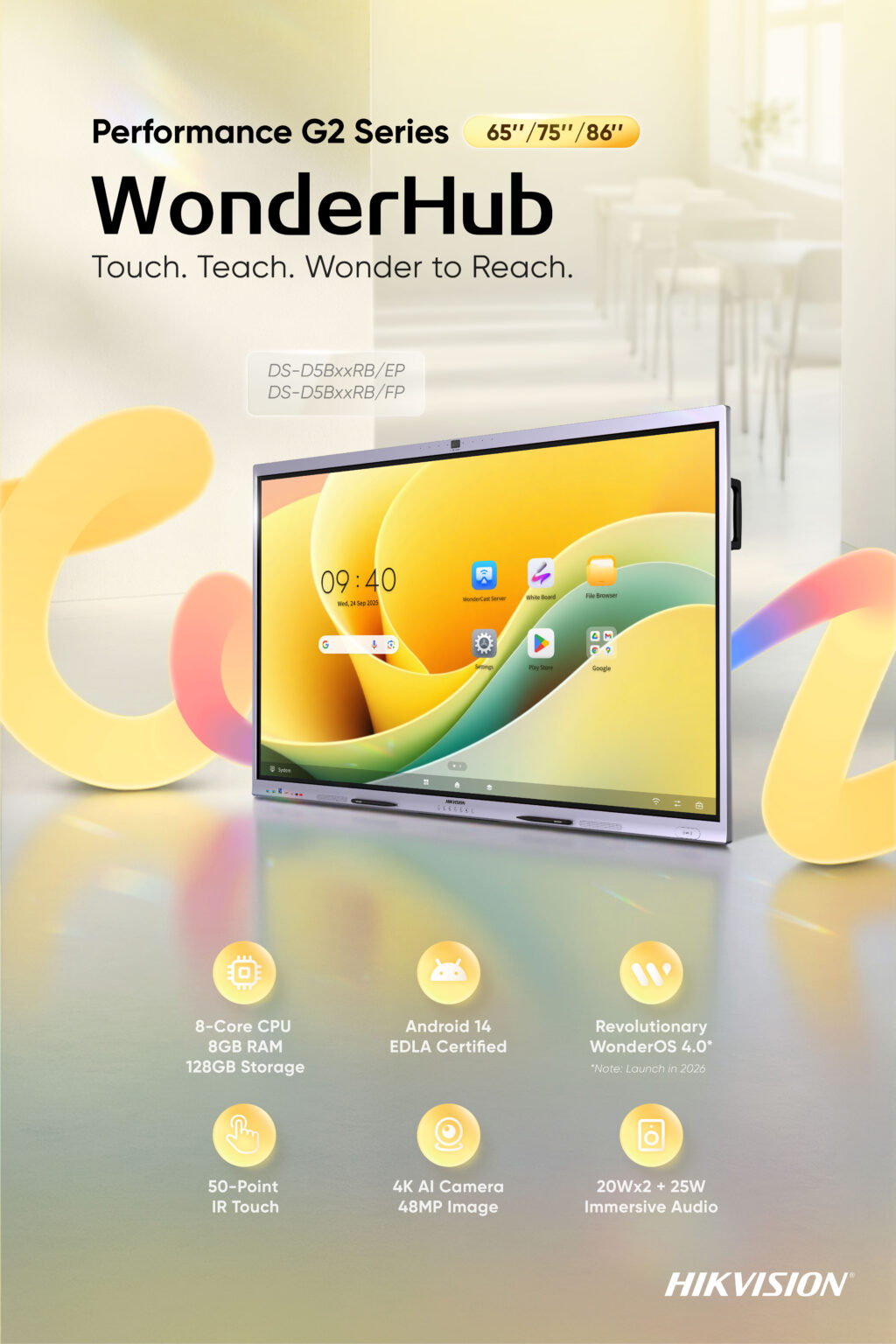 海康威视 HIKVISION WONDERHUB PERFORMANCE G2 交互智能平板是一款现代化的全合一 (All-in-one) 显示解决方案。该系列集成了多达 50 点触控技术,支持多人同时顺畅操作。结合 4K 超高清显示屏 与 450 nits 高亮度,确保在任何环境下都能呈现清晰锐利的画面。硬件方面,该设备搭载了强劲的 8 核 CPU、8GB RAM 与 128GB ROM,并运行最新的 Android 14 操作系统,完美满足多任务处理与各类智能应用的需求。