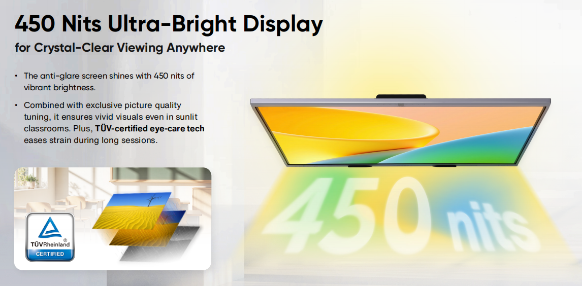 该设备搭载了先进的图像精调技术,呈现出生动逼真的色彩。同时,屏幕集成了通过 TÜV 权威认证的护眼技术,有效减少长时间使用带来的眼睛疲劳。这不仅优化了专业演示效果,更在现代化教学中提供了极佳的视觉保护。