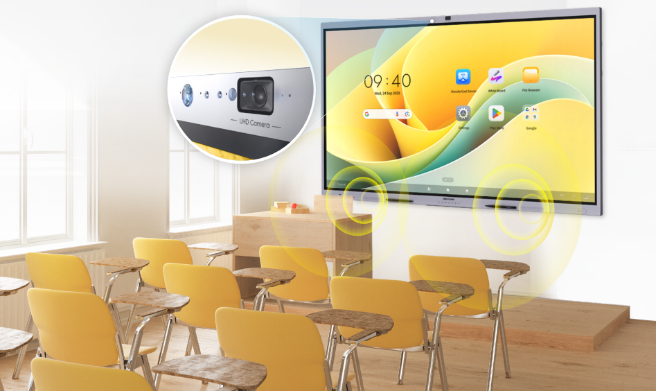 在音频表现上,该设备集成了 2×20W 双扬声器与 25W 低音炮 的强劲组合,能够输出震撼的音效并支持多种模式调节。这一整套音视频方案为远程会议与智慧教学营造了身临其境、专业且高效的互动环境。