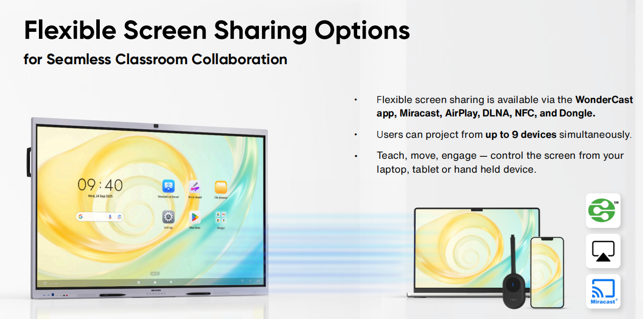 此外,HIKVISION WONDERHUB PERFORMANCE G2 SERIES 还支持通过 AirPlay、Miracast、NFC 等多种协议实现多达 9 台设备同时无线投屏。这一强大功能极大地提升了企业协作与现代教育环境中的互动体验。