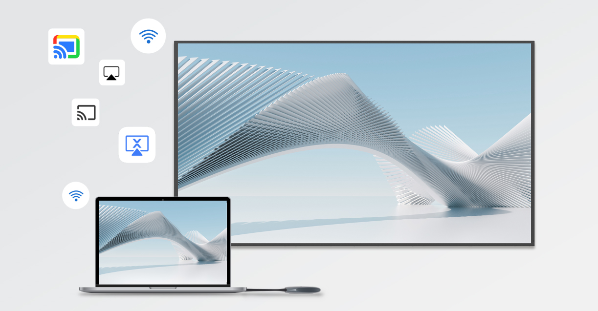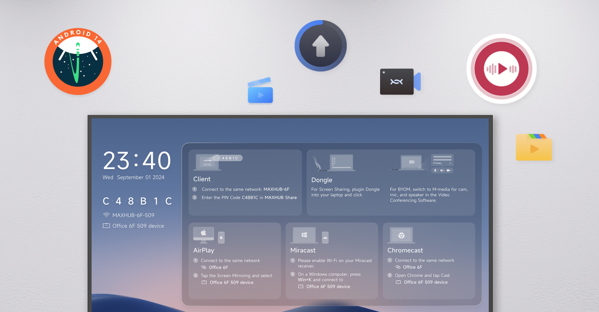系统支持多平台兼容,通过无线传屏器 (Dongle)、MAXHUB Share 软件以及 Miracast、AirPlay 和 Chromecast 等主流协议,实现P2P 直连与灵活的多屏分享。