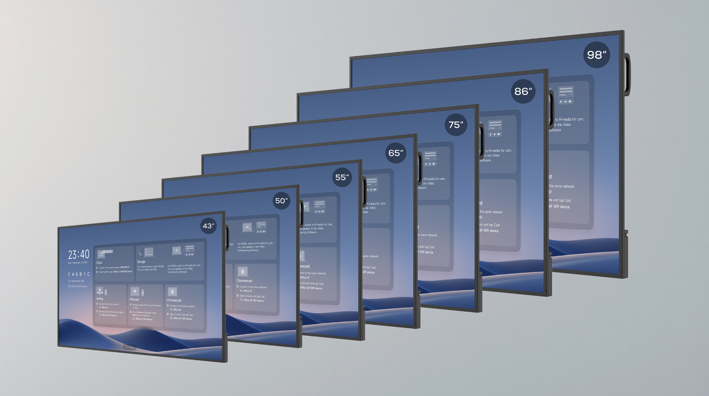 产品提供从 43 英寸到 98 英寸的多种尺寸选择,能够灵活满足从会议室、教室到专业展示区域等各种空间和应用场景的需求。