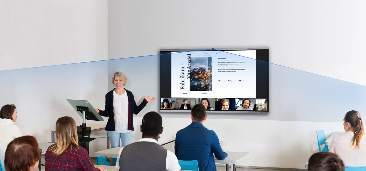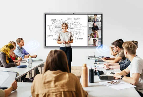 自动取景 (Auto Framing): 屏幕能根据参会人数及位置的变化,自动调整画面构图,确保每位参与者都能以最佳比例呈现在画面中,营造出自然的面对面沟通体验。