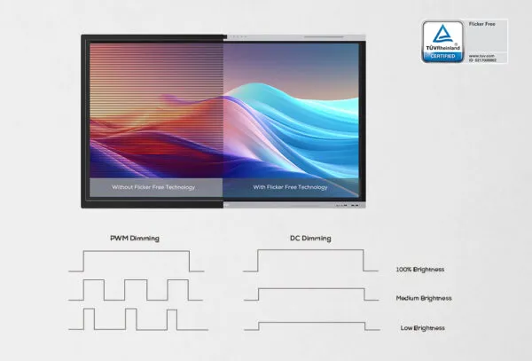 无频闪技术 MAXHUB U8640 采用 DC 调光技术取代了传统的 PWM 调光,从根本上消除了可能导致眼部疲劳和头痛的屏幕闪烁现象。 该屏幕已通过 TÜV Flicker-Free(无频闪)认证,确保用户在长时间观看时能够享受既舒适又安全的视觉体验。 |