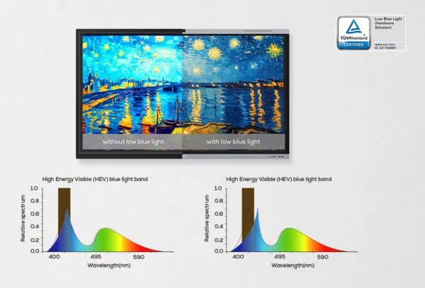 MAXHUB U8640 在优先保护视力的同时,绝不妥协显示质量。凭借经过 TÜV 认证的硬件级低蓝光技术,该屏幕能从源头有效减少有害蓝光。