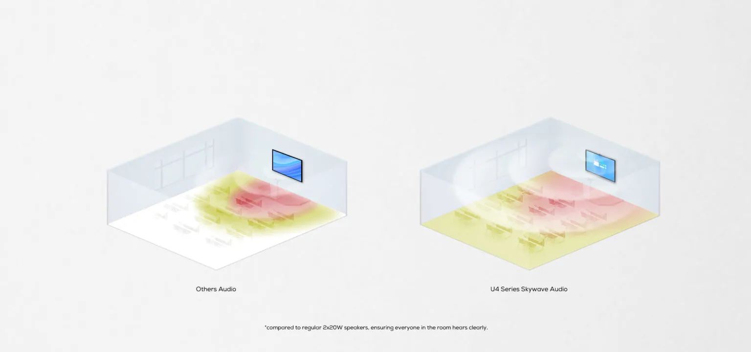 MAXHUB U4 系列搭载先进的 8 阵列麦克风系统,具备高达 12 米的远距离拾音能力,并能保持极高的声音准确度。无论是大型会议室还是开放式空间,每一句发言都能清晰传达。