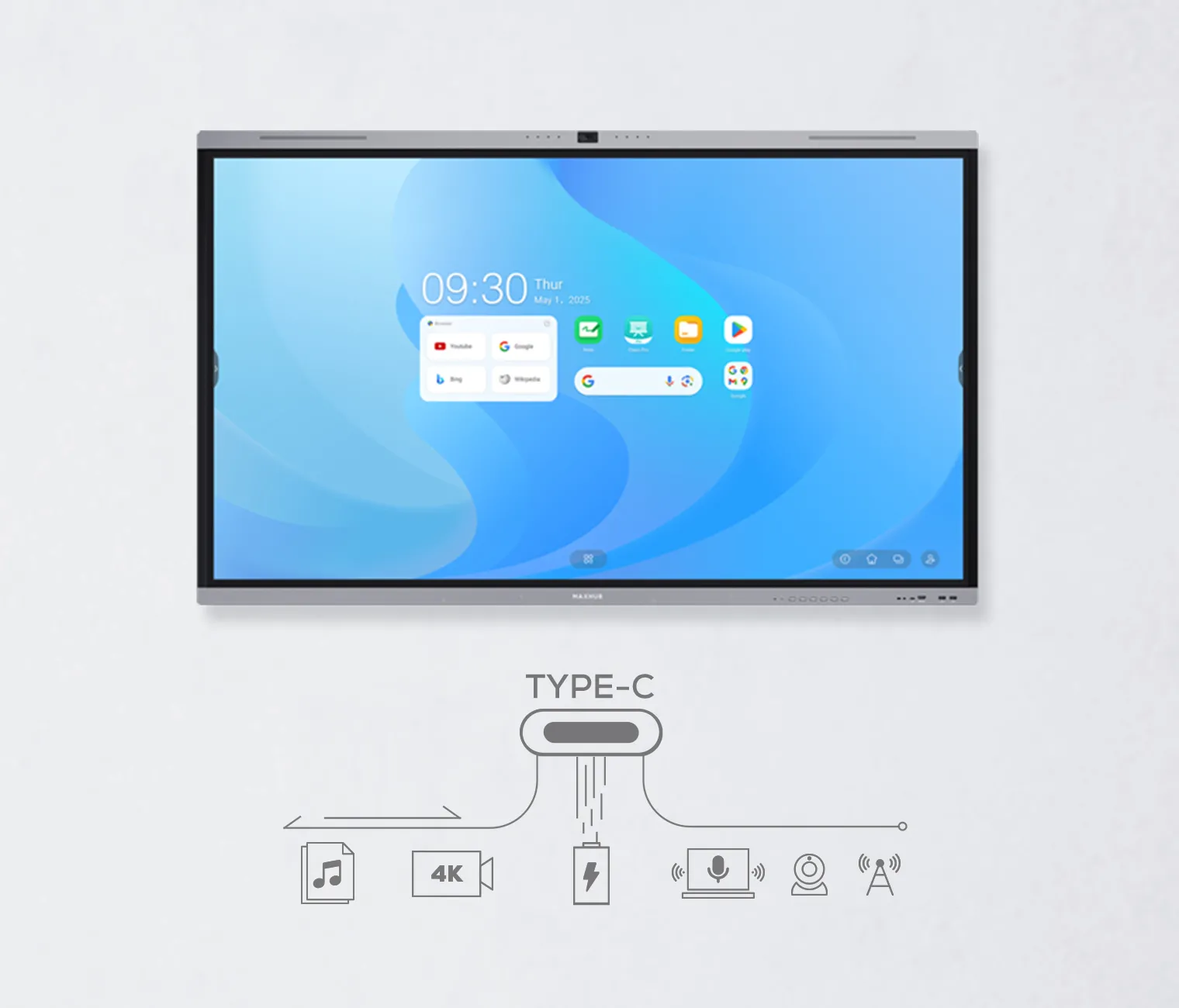 MAXHUB 配备的全功能 Type-C 接口不仅支持外设的快速连接,还能提供高达 100W 的反向充电功率,带来无缝且便捷的使用体验。