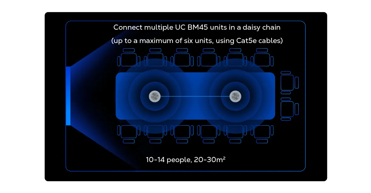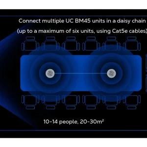 MAXHUB UC BM45 支持通过 Cat5e 网线实现多达 6 台设备的菊花链级联 (Daisy Chain),显著扩大拾音范围并优化会议质量。