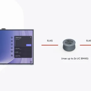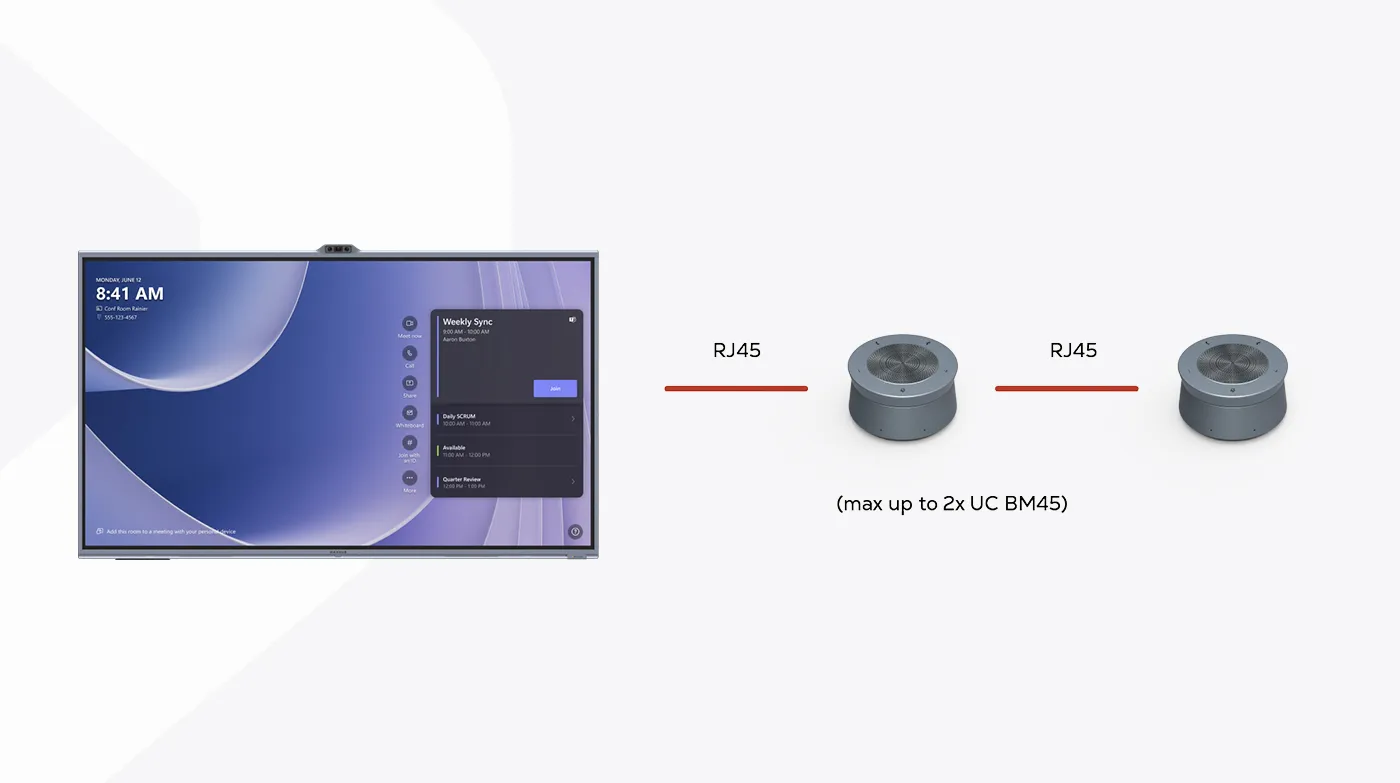 UC BM45 支持通过 RJ45 接口 实现最多 2 台设备的级联扩展,无需复杂设置即可轻松扩大拾音范围。配合交互式智能平板使用,该系统能提供极其流畅的远程会议体验,确保每一次讨论的每一个细节都能被清晰传递。