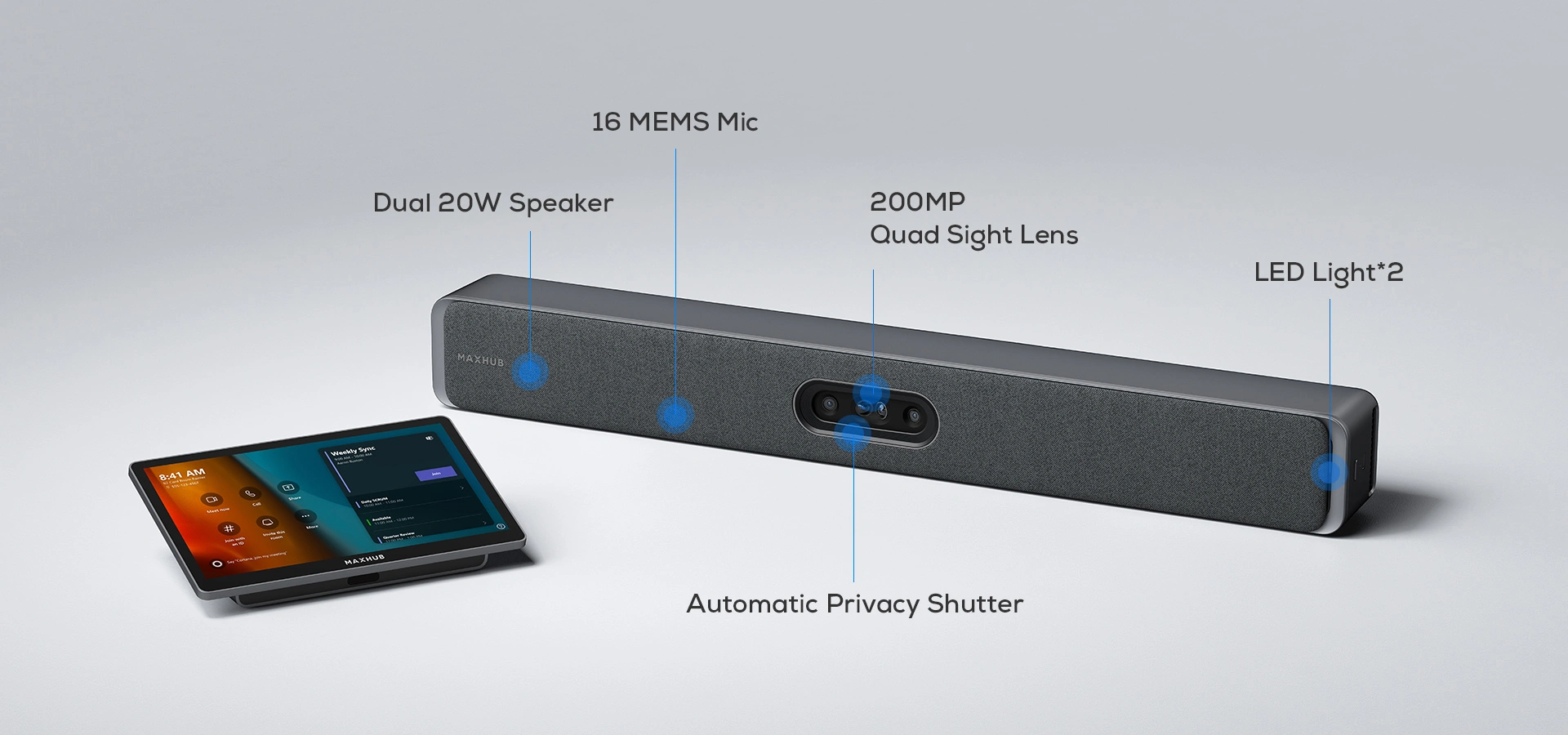 MAXHUB XBAR W70 内置了一颗旗舰级的 4K Ultra HD 摄像头。其超广角镜头不仅能覆盖会议室的每一个角落,更能通过内置的 AI 智能算法 实现自动取景(Auto-Framing)。这意味着无论参会人数如何增减,摄像头都能实时调整焦距与构图,确保全员始终处于画面中心。此外,其具备的 发言人追踪(Speaker Tracking) 功能,能够灵敏捕捉当前讲话者的位置并给予特写,营造出如面对面交流般的自然临场感。