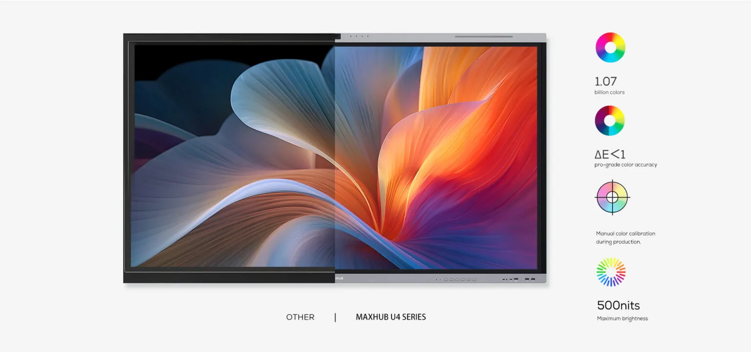 通过 MAXHUB E6530 感受普通屏幕与顶级显示屏之间的非凡差异。该设备拥有 98% sRGB 广色域并支持 10.7 亿色 (10-bit) 显示,还原真实色彩,呈现栩栩如生的画面细节。