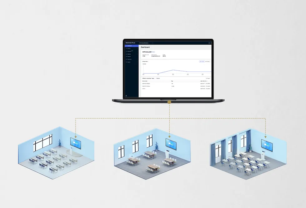 MAXHUB Pivot 提供了先进的云端设备管理平台,支持远程推送通知、课程表及多媒体内容,同时具备增强的安全防护,实现对设备的即时管控。