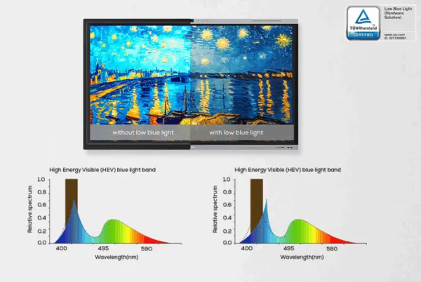MAXHUB E6530 专为最大程度保护视力而设计,搭载有害蓝光过滤技术(400–450nm),并获得 TÜV 低蓝光 (Low Blue Light) 认证,有效减轻长时间使用的眼部疲劳。