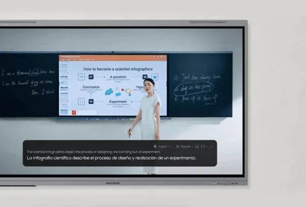 MAXHUB 通过两项智能工具带来全方位的学习与演示体验:实时字幕 (Live Subtitles) 支持为本地或在线的所有视频实时生成字幕,并具备多语言翻译功能,助力消除语言障碍。