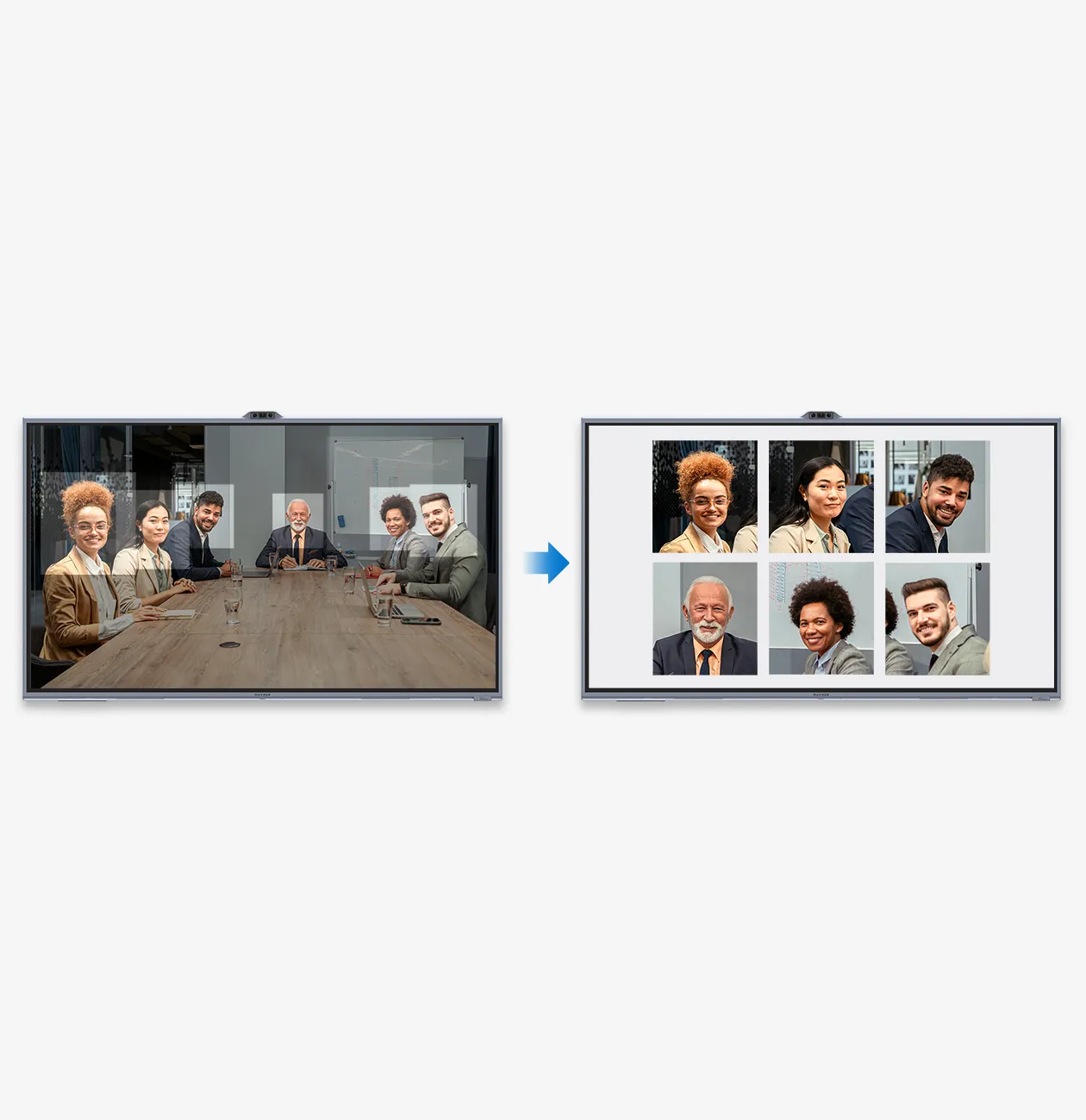 凭借自动取景(Auto Framing)功能,MAXHUB XBoard 能够根据参会人数及其所在位置,实时自动调整画面,以获得最佳视觉角度。这一技术不仅确保了画面的构图比例恰到好处,更营造出一种宛如面对面交流的真实互动感。