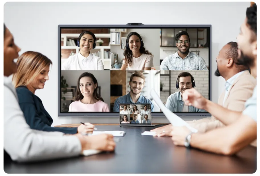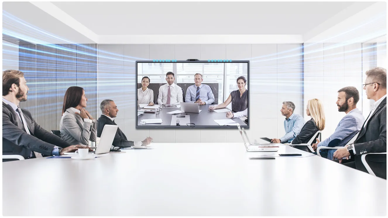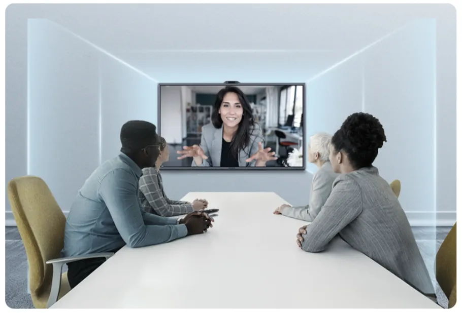 为混合会议提供自然且专注的沟通环境。AI 系统提供多种视图选项,包括会议室全景视图、当前发言人视图以及参会者单人视图。