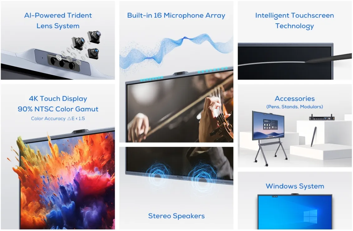 | 摄像头 | 三摄系统: 50MP + 50MP + 50MP (全景+长焦+长焦) 支持 2x 光学变焦,5x 数字变焦;具备自动取景、发言人跟踪等 AI 功能 |