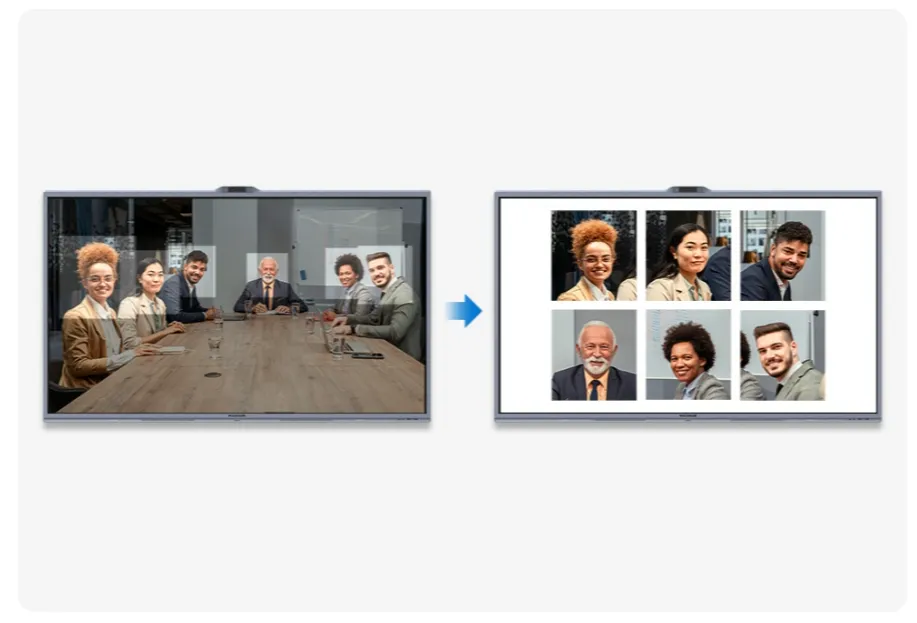 自动取景 (AUTO FRAMING) XBoard V7 具备自动取景功能,MAXHUB XBoard 屏幕能够根据参会人数及其所在位置自动调整画面,以实现最佳视角,从而营造出宛如面对面交流的互动体验。 |