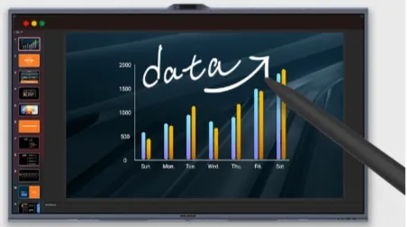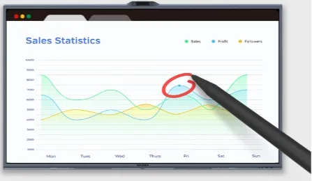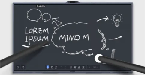 只需点击一下即可开启白板,投入高效的创意头脑风暴。设备具备 50 点触控功能,支持多人同时书写,并预装了丰富的图形模板。